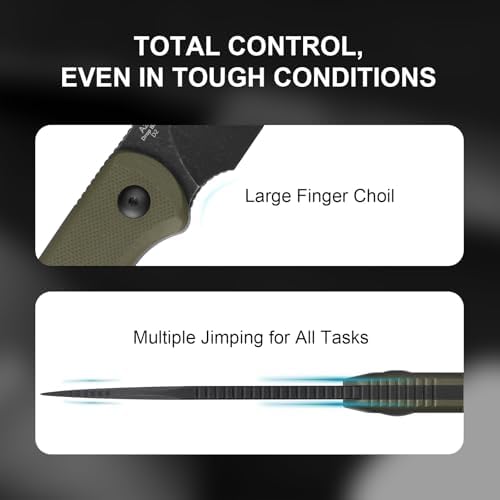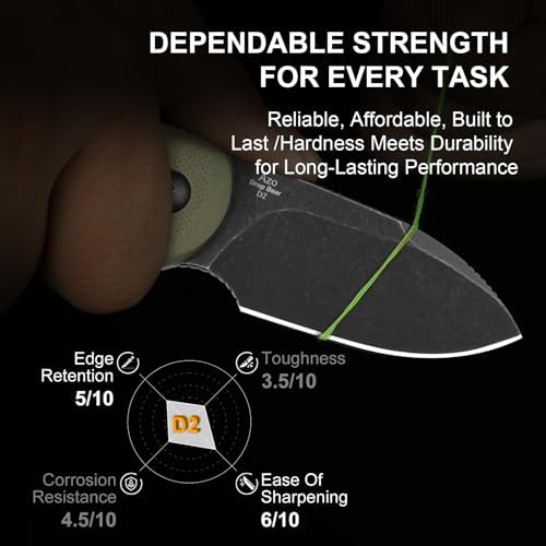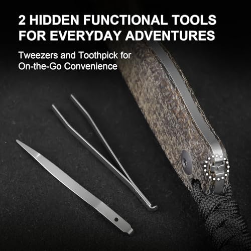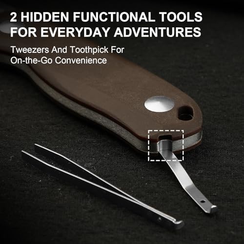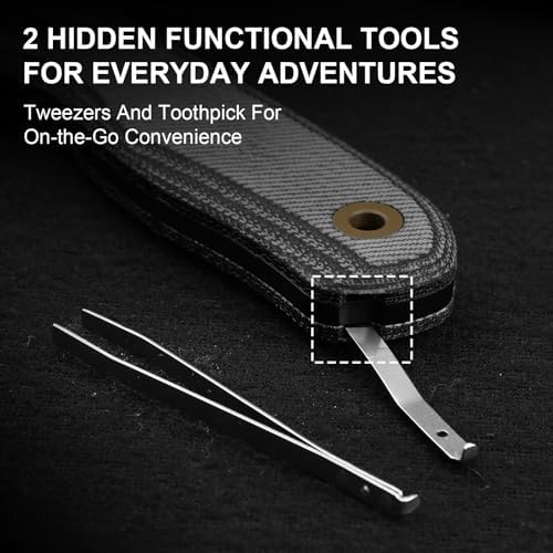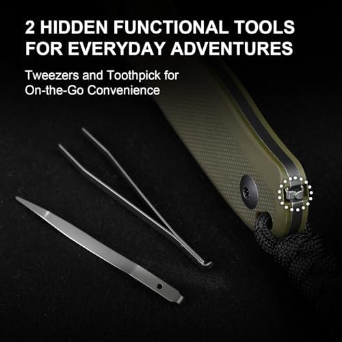 This versatile EDC knife comes equipped with an olive green G10 handle that boasts a non-slip texture, ensuring a secure grip in all conditions. It features cleverly concealed tweezers and toothpicks, perfect for tackling small tasks like removing splinters or preparing food.