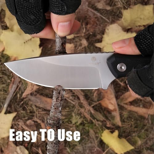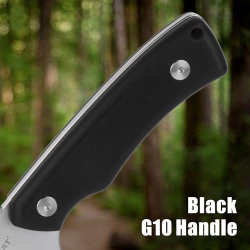 The knife features a black G10 handle noted for its superior strength and slip resistance. This ergonomic design offers a stable and comfortable grip, making it the perfect companion for various outdoor activities.